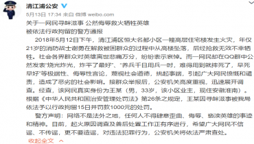 公然侮辱救火牺牲消防战士 一网民被拘15日罚款1000元