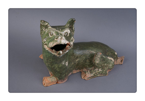 东汉,陪葬用品。汉滨区建民镇联合村出土。高26cm,长29cm,宽15cm。绿釉红陶,卧姿,昂首张口,竖耳卷舌,后腿屈曲有力,作跃起之状。……